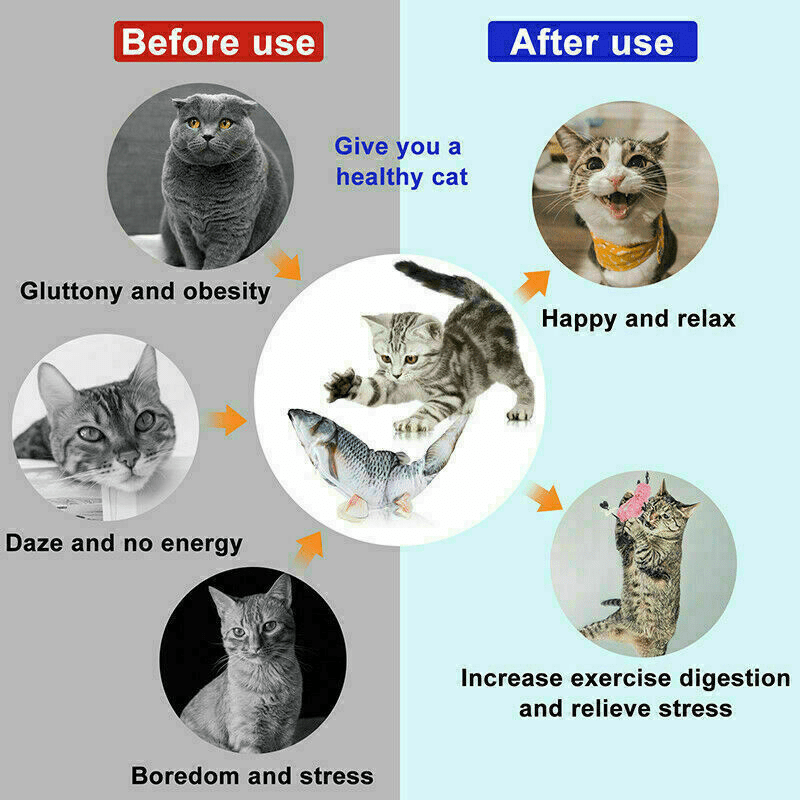 This floppy fish cat toy has a clear and realistic fishy appearance, making it easy to catch cat's interest. And the electric wagging fish move the tail to attract the cats to catch them, let your kitten deeply c